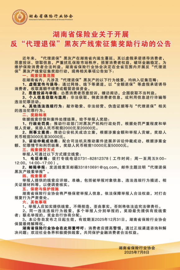 湖南省保险业关于开展反“代理退保”黑灰产线索征集奖励行动的公告